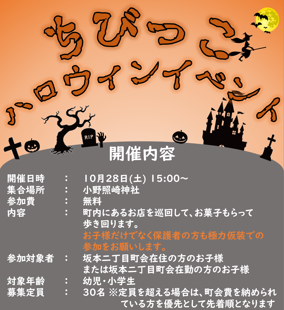 昨年ご好評いただきました、ハロウィンイベントを 本年も開催いたします。 お子様と坂本二丁目町会内のお店を巡回してお菓子をもらうイベントとなります