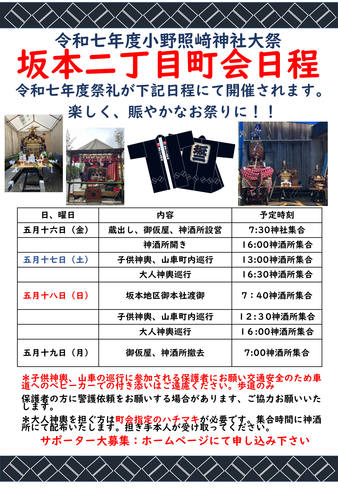 町会ではサポーターを募集しておりますが、 同様に祭礼開催期間のサポーターを募集いたします。 ※詳しくはサポーター制度についてご確認ください